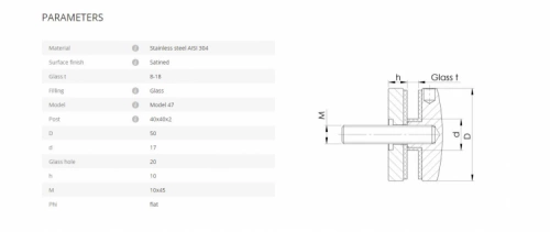 Kräver 20 mm hål i glaset. Fäst klämfästet i en M10-blindnitsmutter. Klämfästet använder knappt 30 mm av gängstången vid montage av ett 8 mm tjockt glas. Totallängd för gängstången är 50 mm. Gängstången är löstagbar och kan ersättas med M10-gängstift för infästning i trä.